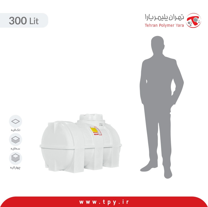 با توجه به توصیه سازمان آب و فاضلاب، به ازای هر واحد مسکونی در طول یک شبانه روز میبایست ۲۵۰ لیتر آب جهت ذخیرهسازی در نظر گرفت. پس میتوان گفت یک مخزن ۳۰۰ لیتری یک گزینه مناسب برای ساختمان تک واحدی میتواند باشد. منبع ۳۰۰ لیتری افقی در انواع تک لایه، سه لایه و چهار لایه تولید میشود که نوع سه لایه و چهار لایه آن دارای لایه آنتی باکتریال میباشد که این لایه مجز به این میشود تا آب شرب داخل این مخزن قارچ و جلبک نزند و همیشه سالم بماند. تمامی مخازن پلی اتیلن سه لایه و چهار لایه، به خاطر داشتن یک لایه ضد یووی، میتوانند زیر نور مستقیم خورشید نگهداری شوند و هیچ مشکلی برای خود مخزن یا محتویات آن پیش نیاید. تانکر ۳۰۰ لیتری دارای سه پایه در زیر خود است که این مهم سبب میشود. در زمان پر شدن این محصول از مایعات مختلف فشار آب در کف مخزن به طور همگن تقسیم شود تا در طولانی مدت آسیبی به آن وارد نشود که این مهم سبب افزایش طول عمر مخزن ۳۰۰ لیتری افقی میشود. این محصول دارای ۶۵ سانتیمتر عرض و ۱۰۷ سانتیمتر طول میباشد و همچنین ارتفاع منبع ۳۰۰ لیتری خوابیده یا افقی، ۷۴ سانتیمتر است.